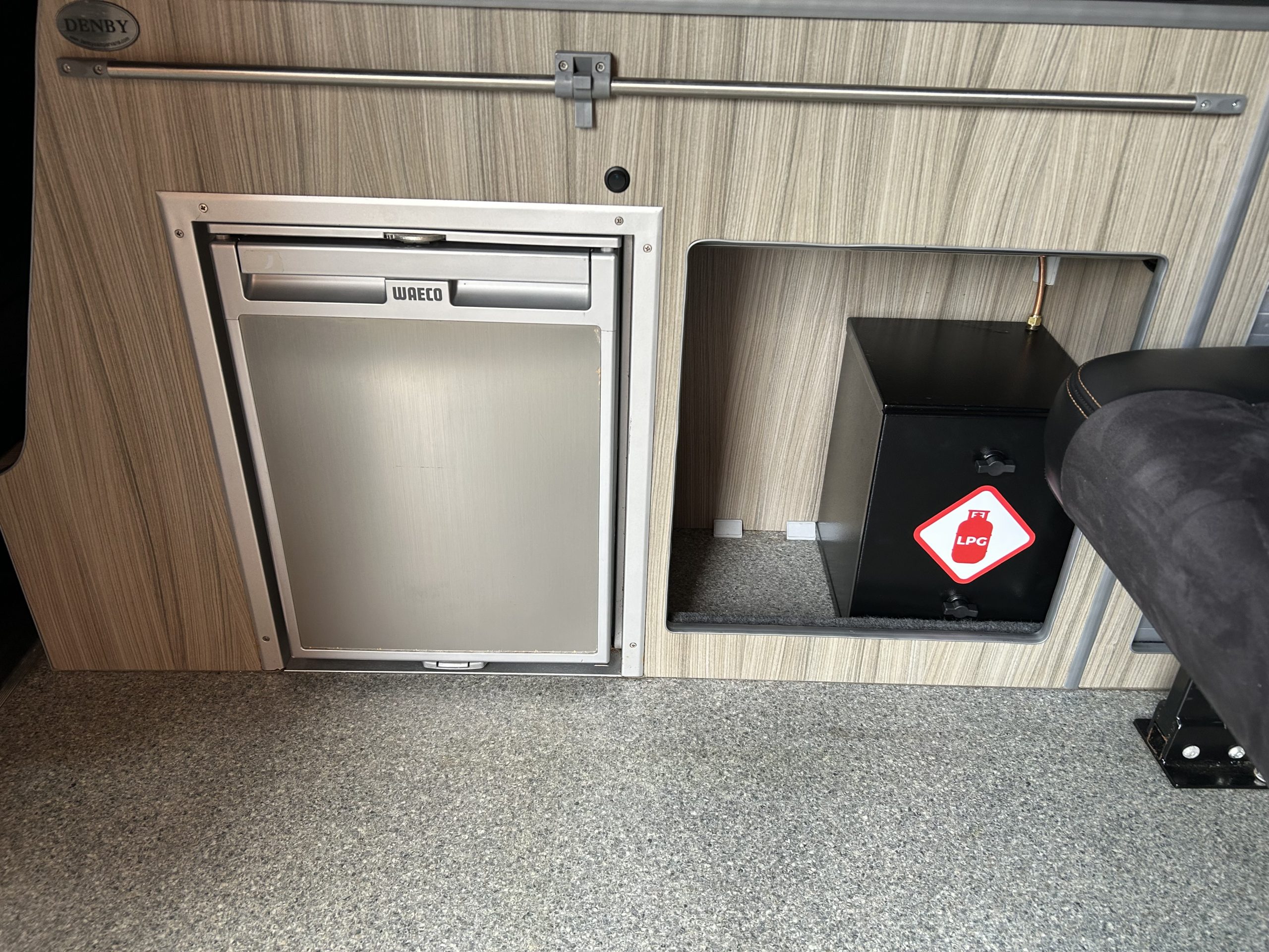 - Dometic fridge and 2 burner gas hob, stainless sink and tap. Under-vehicle water tank. Awning rail for easy driveaway awning attachment.
